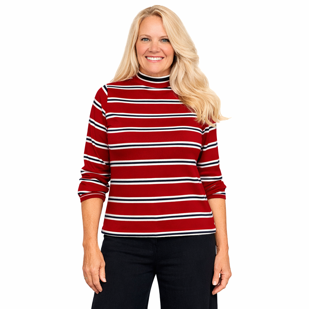 Red sweater with navy & white stripes